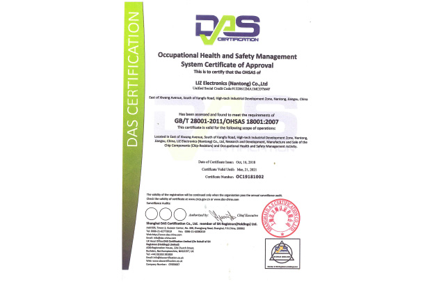 2018年南通工廠取得OHSAS 18001:2007證書