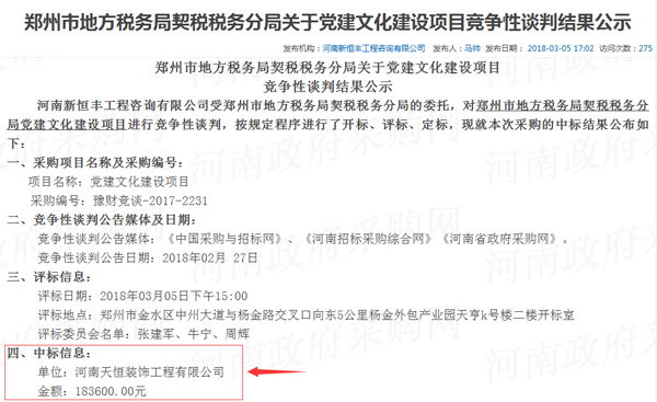鄭州市地方稅務(wù)局契稅稅務(wù)分局關(guān)于黨建文化建設(shè)項(xiàng)目競(jìng)爭(zhēng)性談判結(jié)果公示